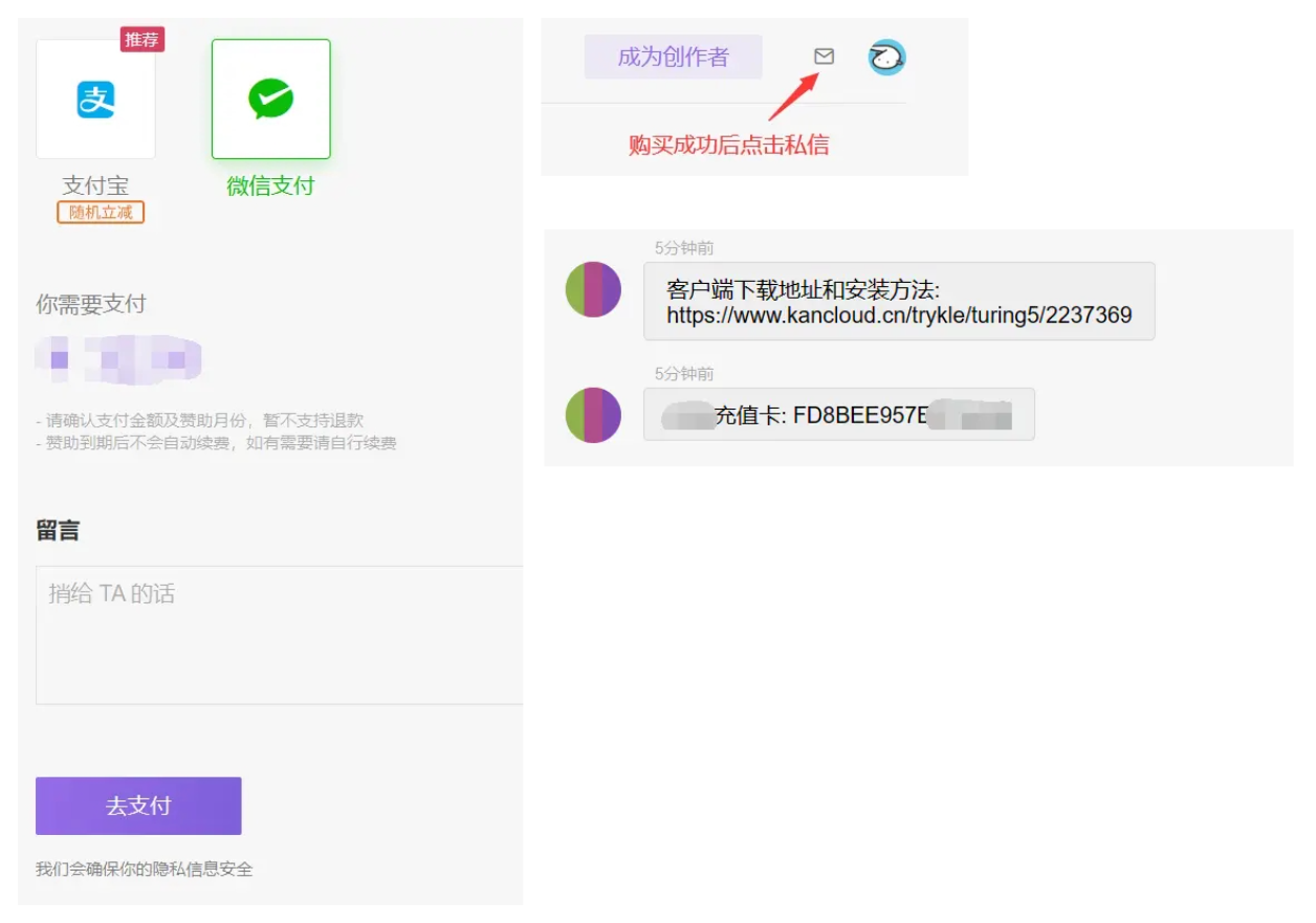 购买前,请先注册一个【爱发电】网站的账号,此账号用于【付款】和【接收充值激活码】