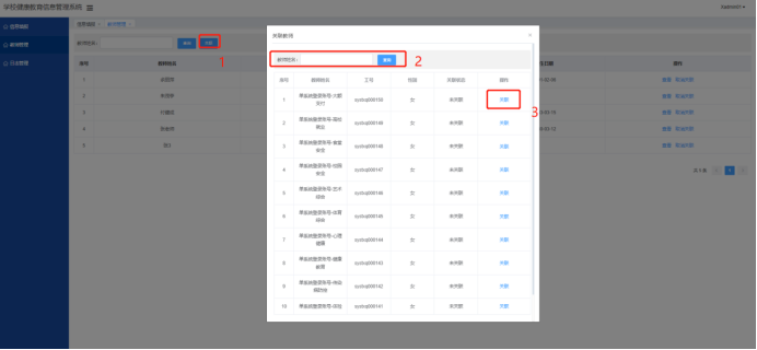点击关联按钮,查询需关联教师,点击关联,将教师关联到本系统