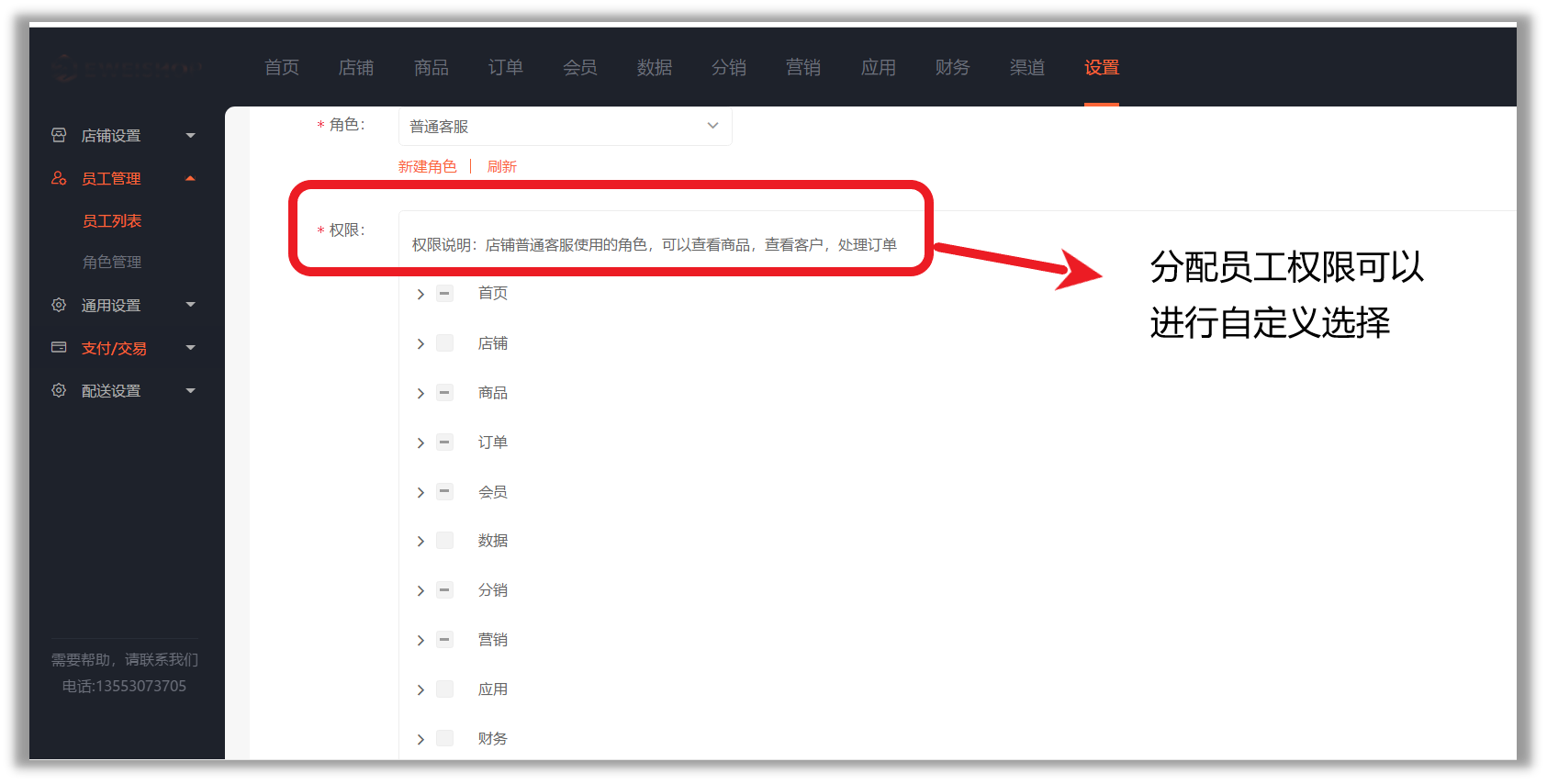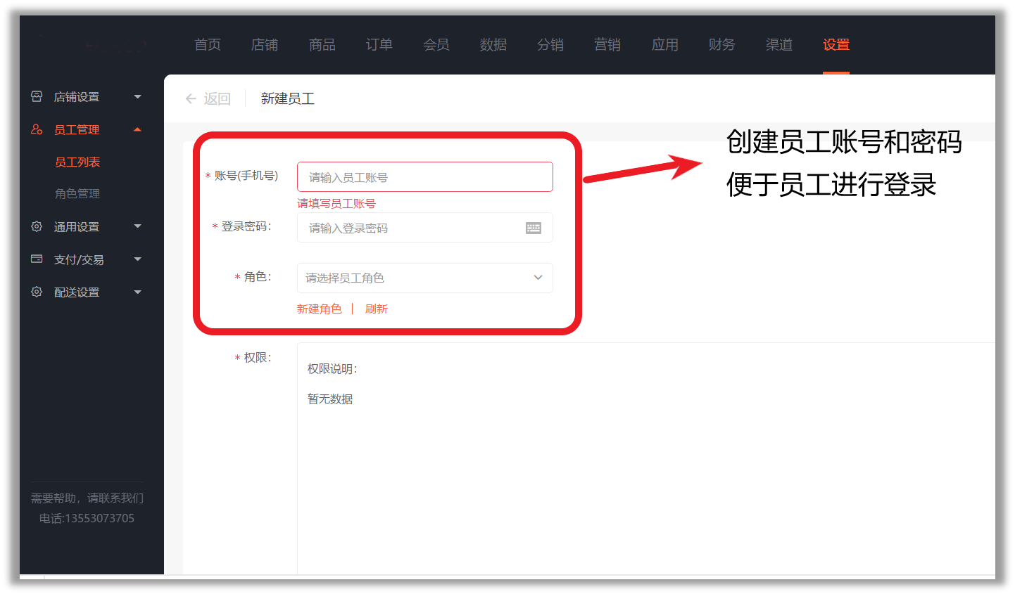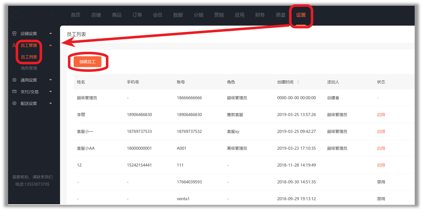 1、创建员工:登录UESHOP →选择店铺→点击“设置”→点击“员工管理”→点击“员工列表”→创建员工