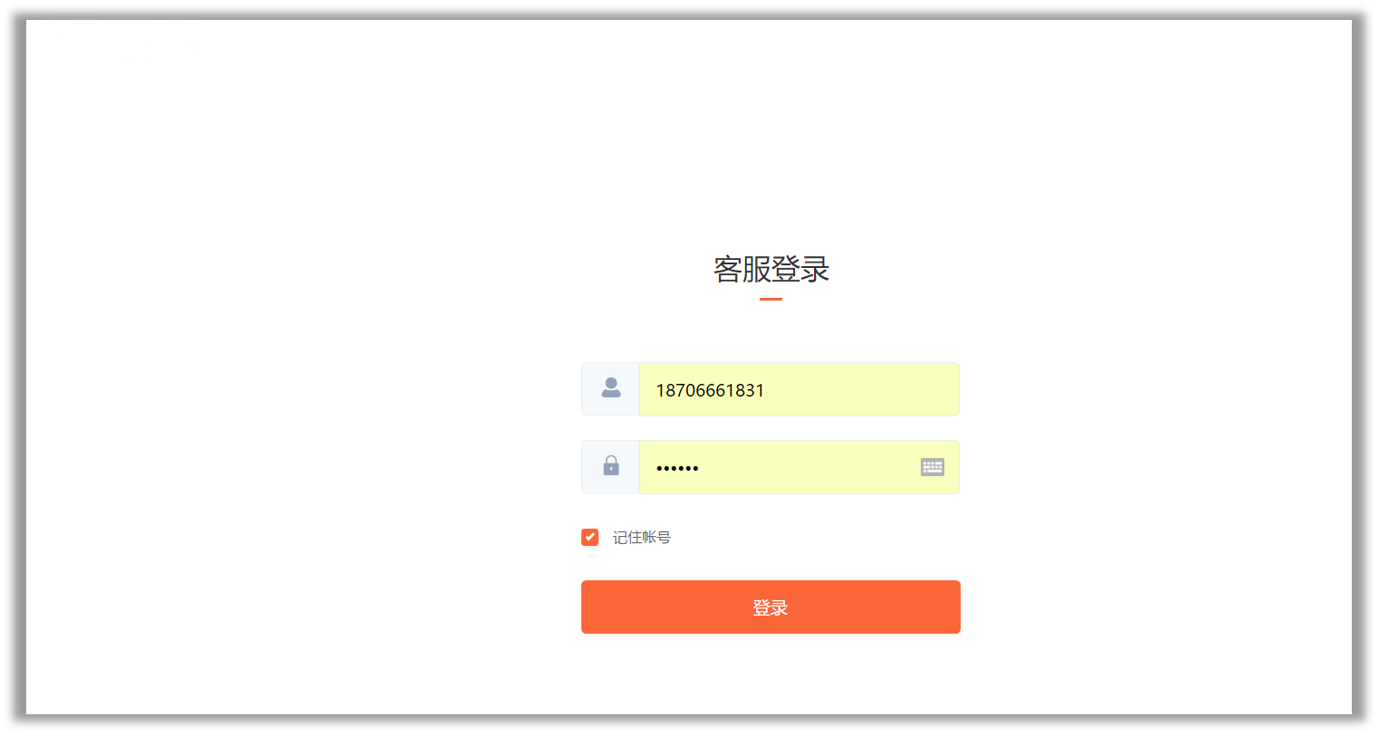 再次登录的界面则为客服登录界面。可以直接使用【客服账号】和【密码】进行登录了。