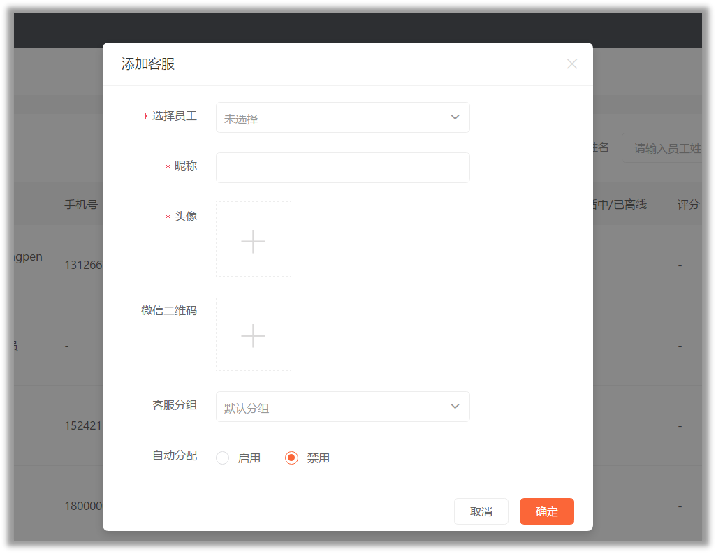 2、添加客服:选择“客服”→“客服管理”板块→点击“添加客服”→选择刚才添加的员工,设置后保存。