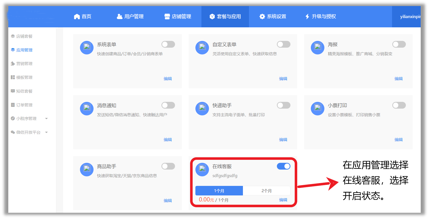 登录UESHOP管理端→选择套餐与应用→应用管理→在线客服→选择“打开”状态。