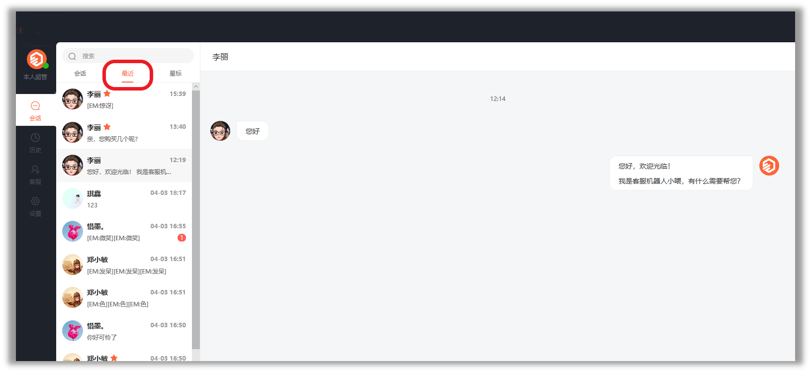 3. 最近:最近接入的会话信息与联系人。包括:联系人、会话内容、会话时长、会话详情等。