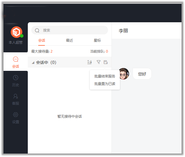 2. 会话:显示当前接入的会话信息。其中包括:会话内容、会话时长、会话详情等。