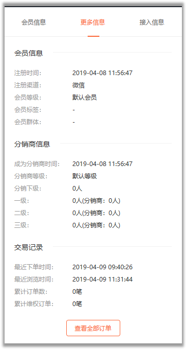 b.分销商信息:成为分销商时间,分销商等级,分销订单,分销下级
