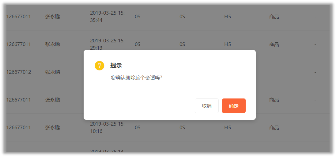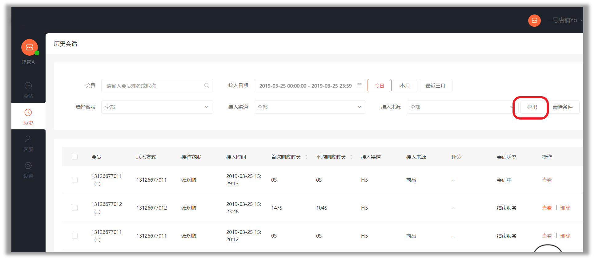 1.历史会话列表:显示会员昵称(姓名),联系方式,接待客服,接入时间,