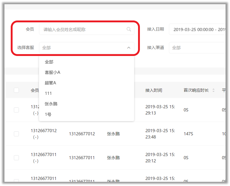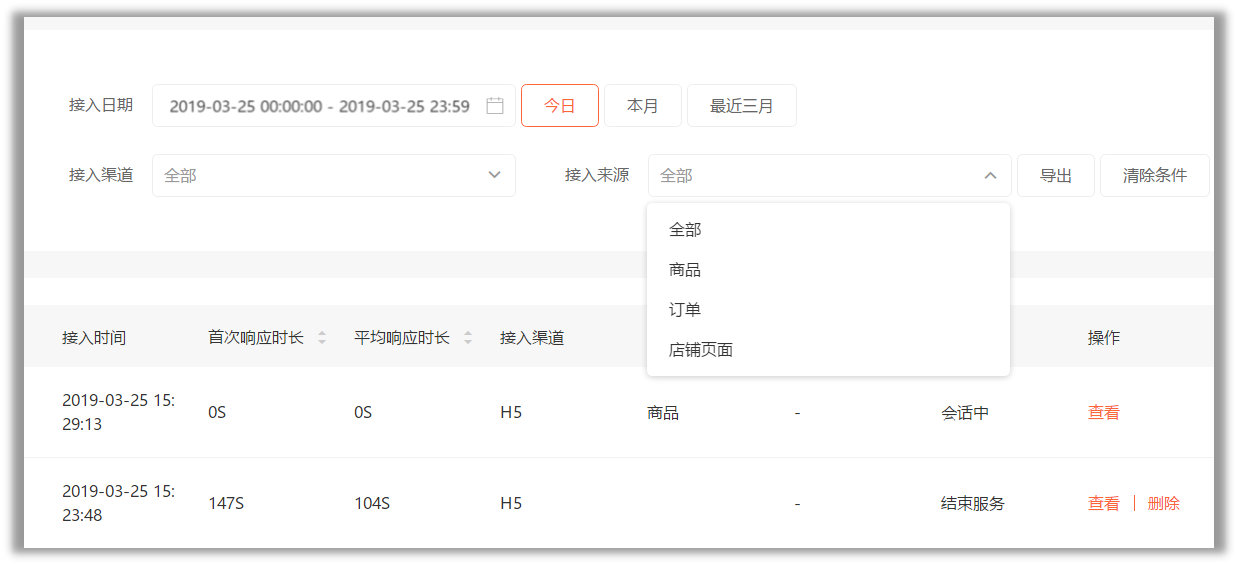 首次响应时长(可排序),平均响应时长(可排序),接入渠道,接入来源,发起方式,会话状态