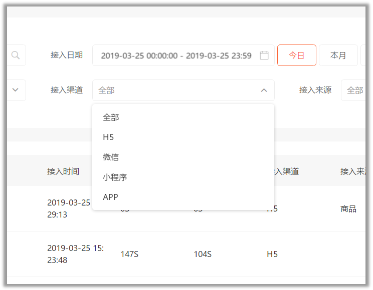 5.接入渠道:多选下拉框,默认选择全部,可根据接入渠道进行筛选