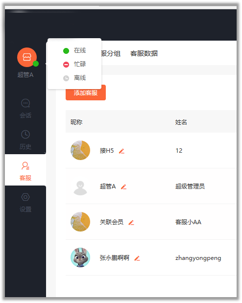 亲爱的老板~首先在了解客服系统的功能之前,我们要了解一下客服的状态,