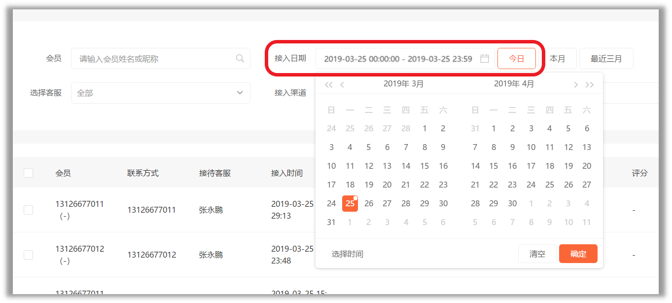 3.接入时间:可根据介入时间进行筛选(默认选择今日)