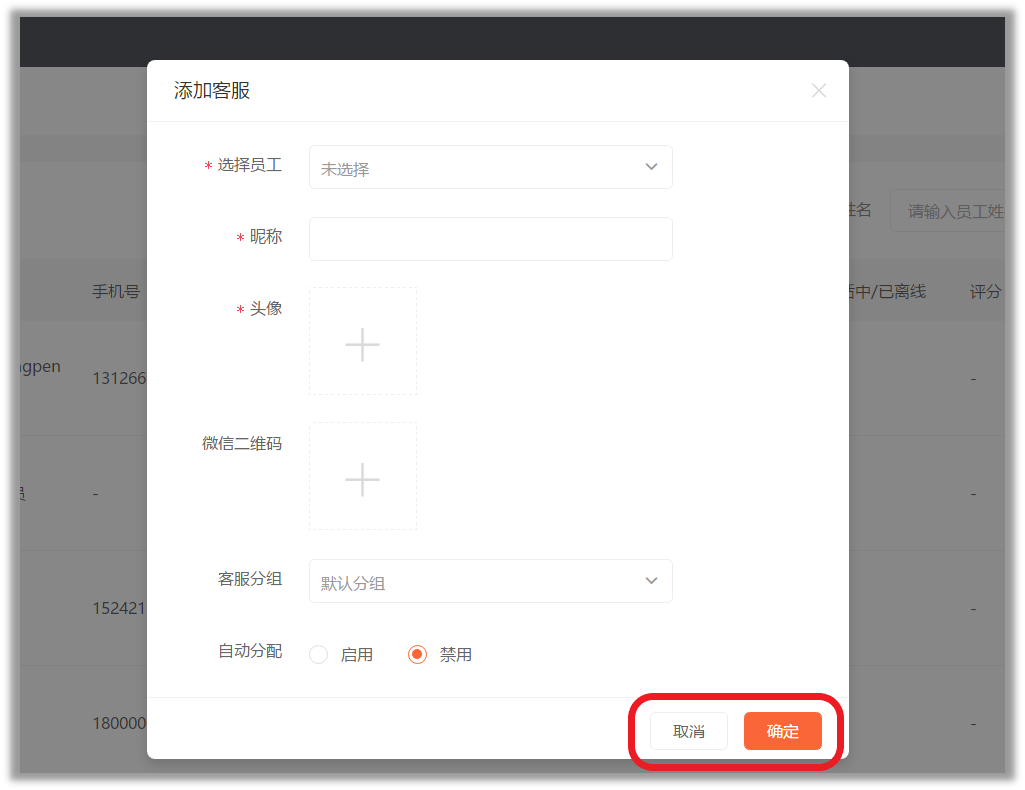 1.添加客服:点击添加客服弹出【添加客服】弹窗。
