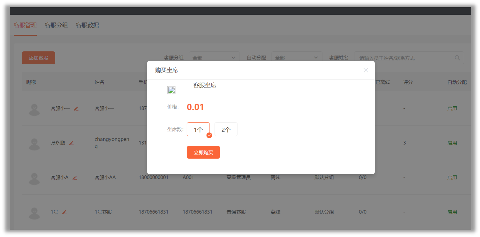 点击购买:弹出购买客服坐席弹窗。