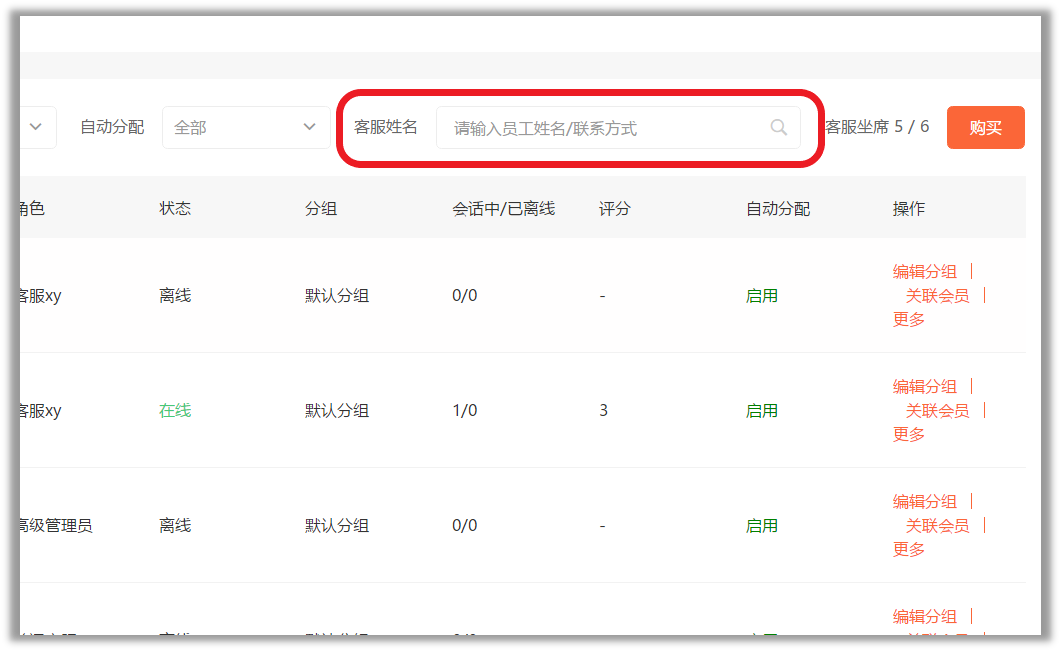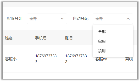 2.可根据筛选条件对设置的客服进行查找,筛选条件介绍如下