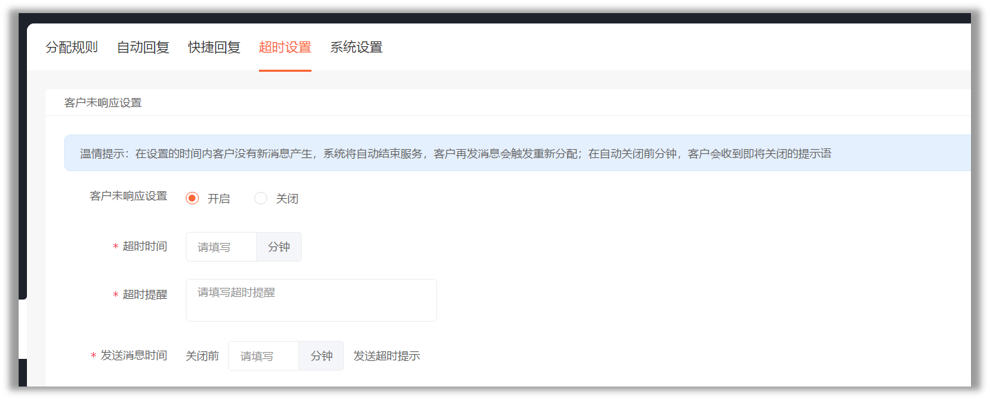 超时提示:默认“由于长时间没有回复客户的咨询,稍后系统将自动结束会话”