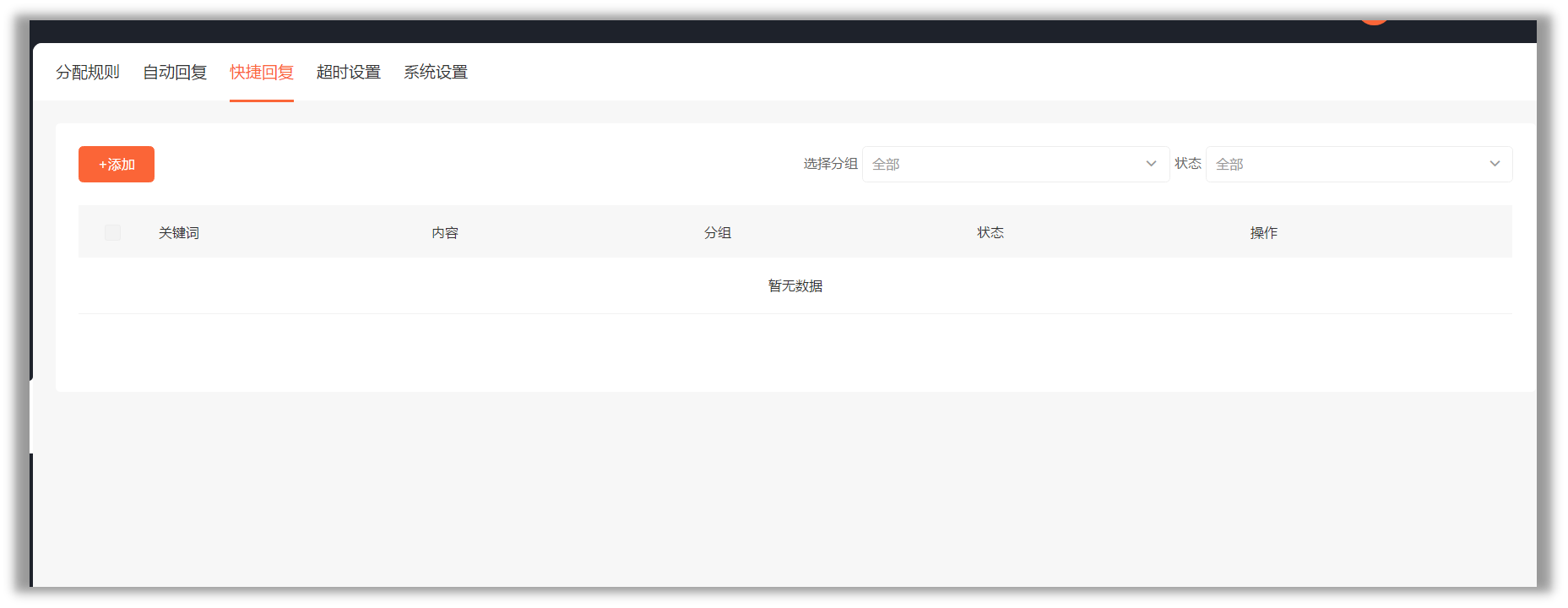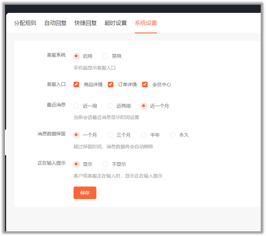 首先我们要了解,客服系统的设置可分为五大部分:设分配规则,自动回复,快速回复,超时设置,客服系统设置。