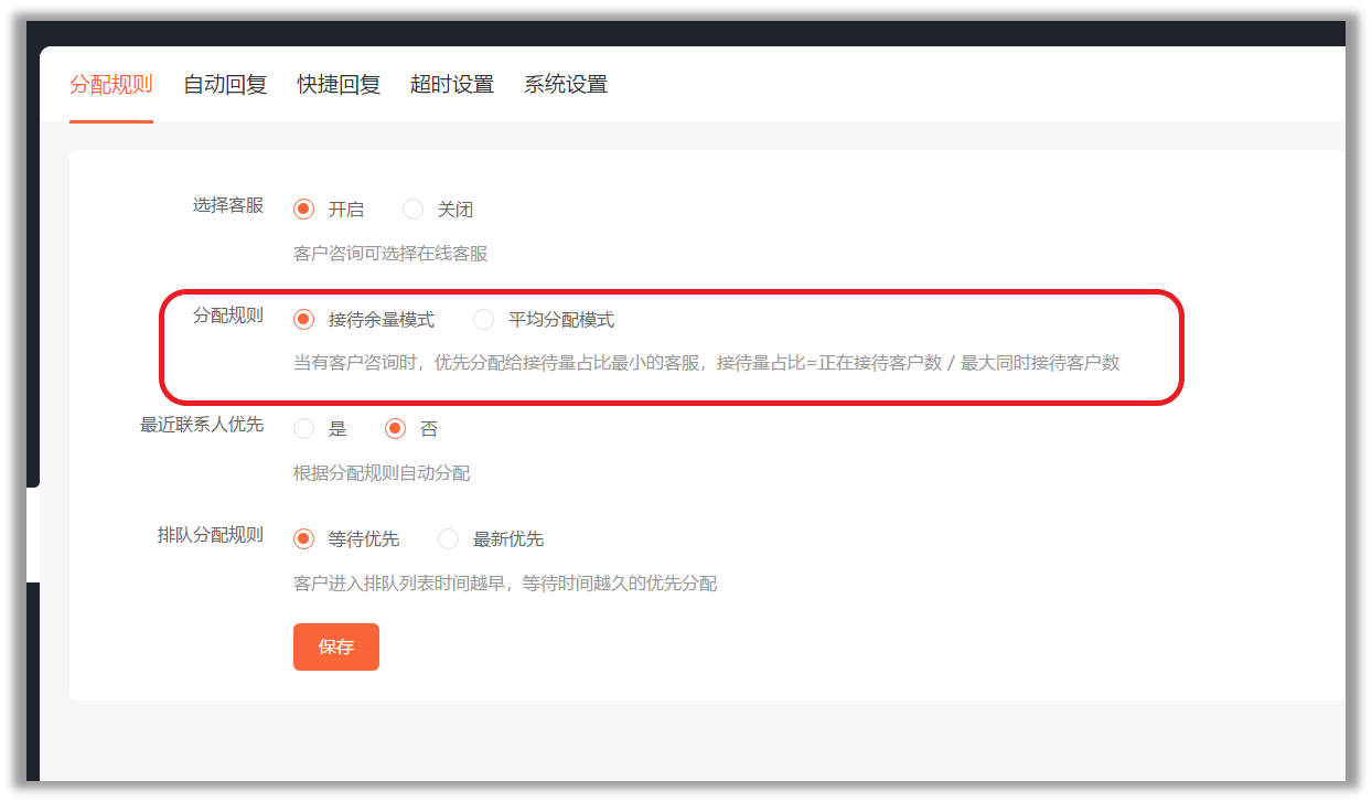 选择接待余量模式时,优先分配接待量占比小的客服,接待量占比=正在接待客户数/最大同时接待客户数
