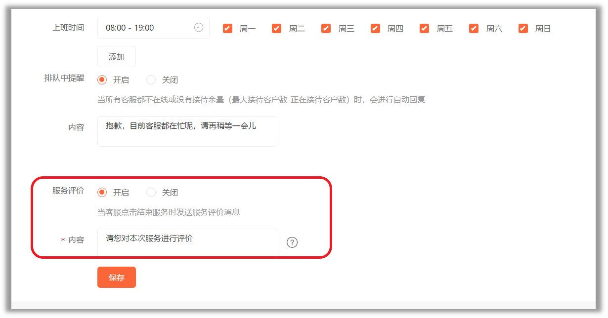 4.服务评价:默认开启(选择关闭时不显示内容选项)