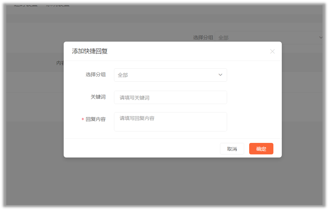 2.选择分组:单选下拉框,默认选择全部,可根据分组查看快速回复内容