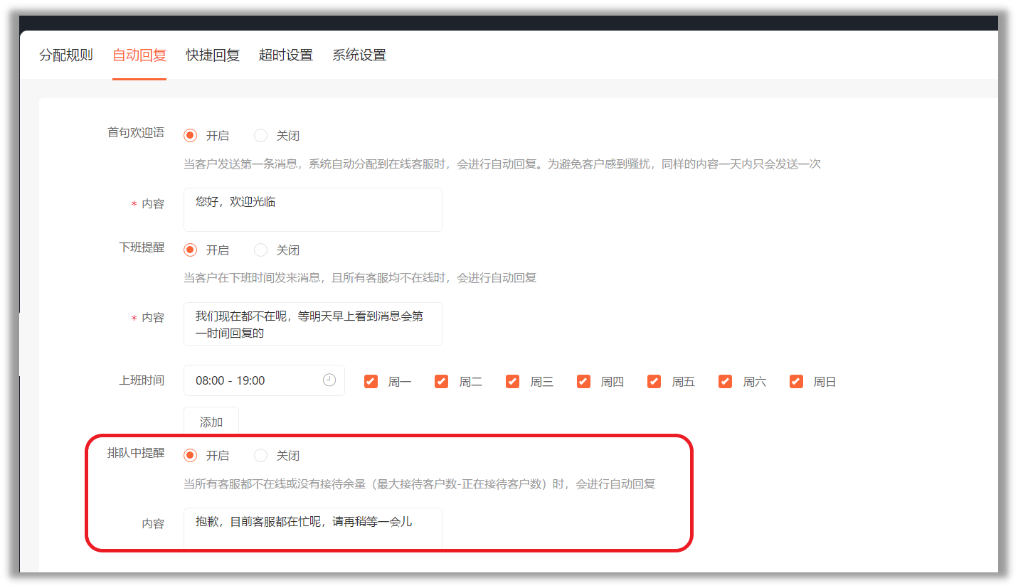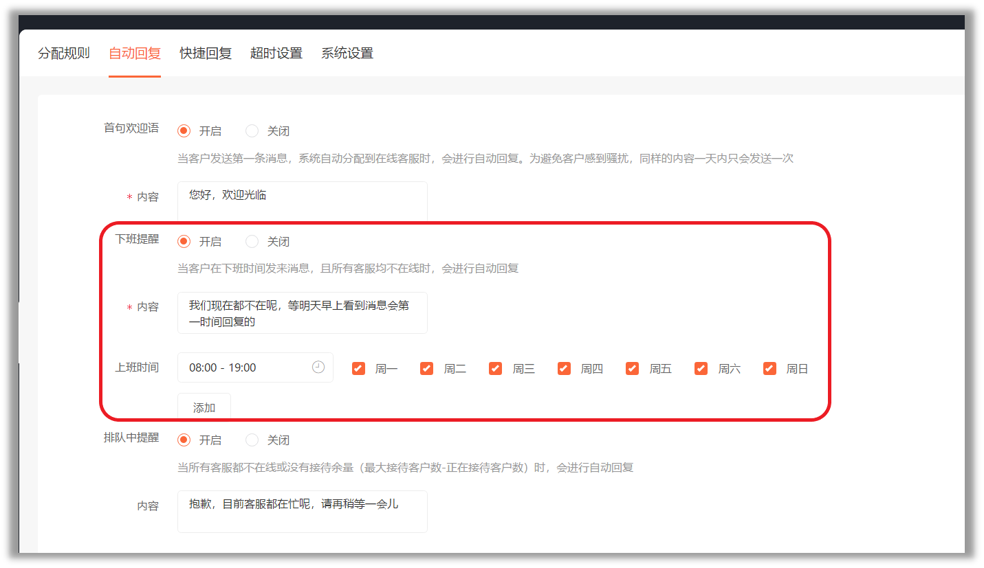 当客户在下班时间发来消息,且所有客服均不在线时,会进行自动回复。