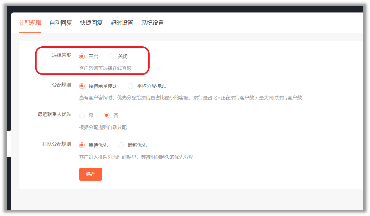 提示:当有客户咨询时,优先分配给接待量占比最小的客服,接待量占比=正在接待客户数/最大同时接待客户数