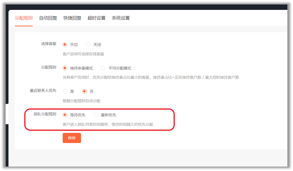选择【等待优先】时,提示:客户进入排队列表时间越早,等待时间越久的优先分配