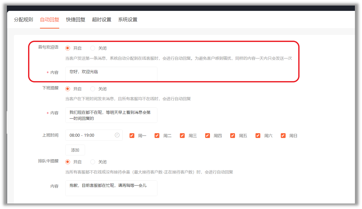 1.首句欢迎语:默认开启(选择关闭时不显示内容选项)