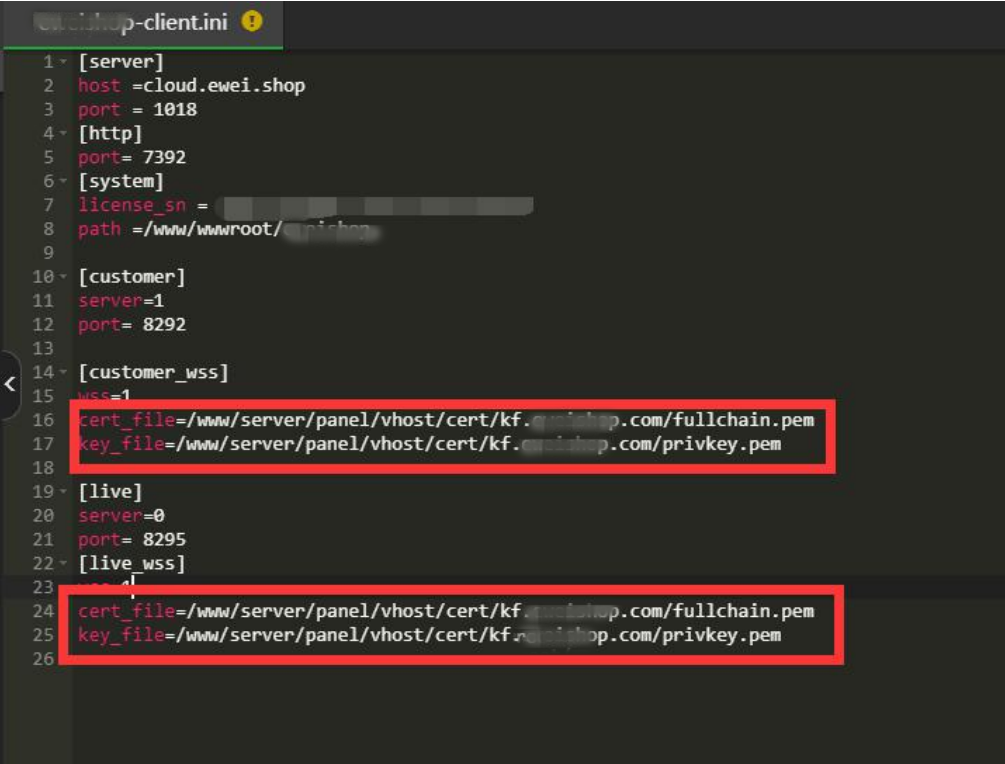 将步骤 3 中获取的 ssl 证书路径替换ueshop-client.ini中ssl文件路径