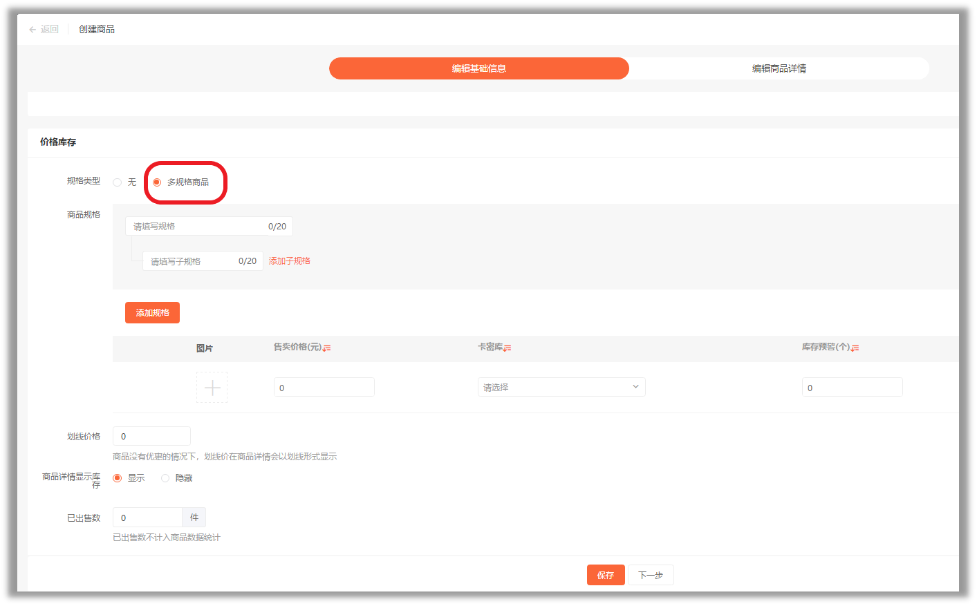 添加完卡密库和卡密,下面就可以添加卡密商品啦!有单规格和多规格两种商品方式!