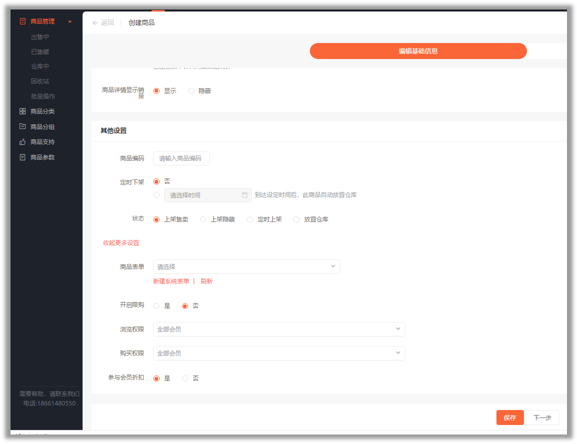 4、其他设置中,移除(快递运费、运费模板、商品详情显示快递、商品重量),新增“定时下架”选项,默认否;