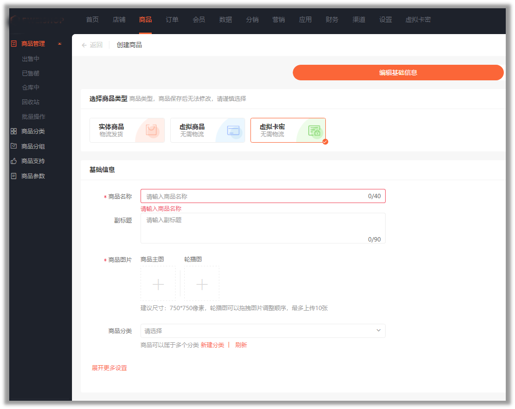 添加虚拟商品也是在商品中,点击【创建商品】,商品类型选择【电子卡密】;