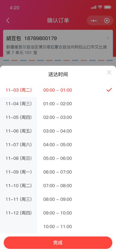 选择细分时段为天时,买家可以选择10:00 - 11:30一个时间段。
