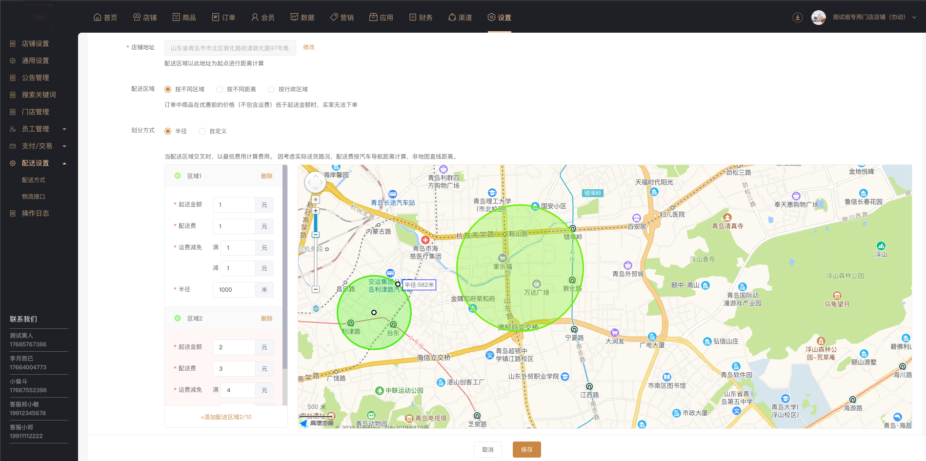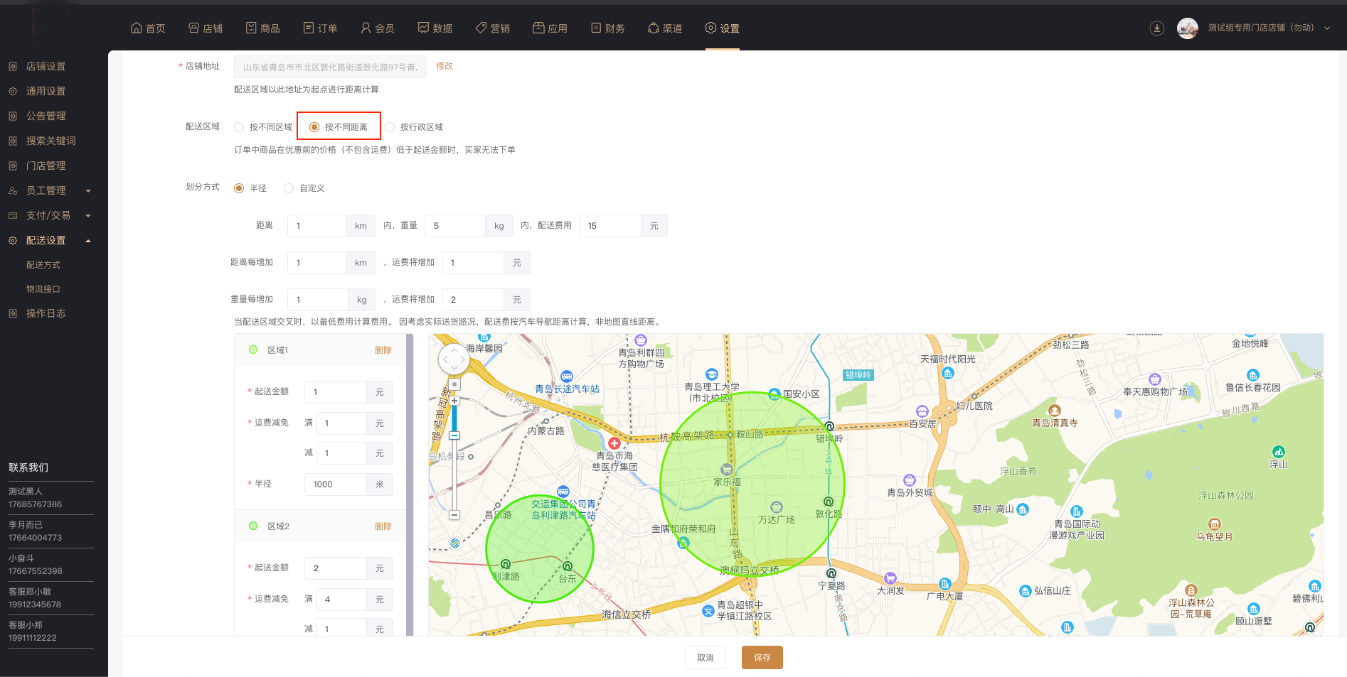 按不同区域配送:区域可按半径划分,也可自定义区域。区域位置可以自由拖动修改,配送费用和配送优惠按不同的配送区域进行设置。