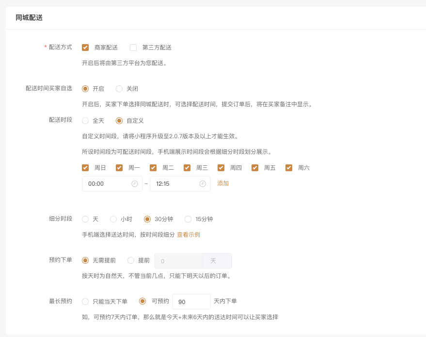 细分时段:可以按天,小时,30分钟,15分钟来细分所设置的配送时段,买家下单时选择送达时间为细分后的时间段。