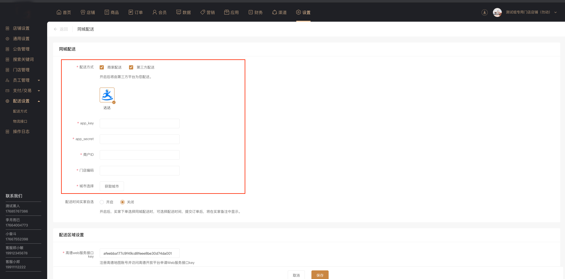第三方配送支持达达配送,勾选后,需要设置app\_key、app\_secret等参数用于和达达平台对接。