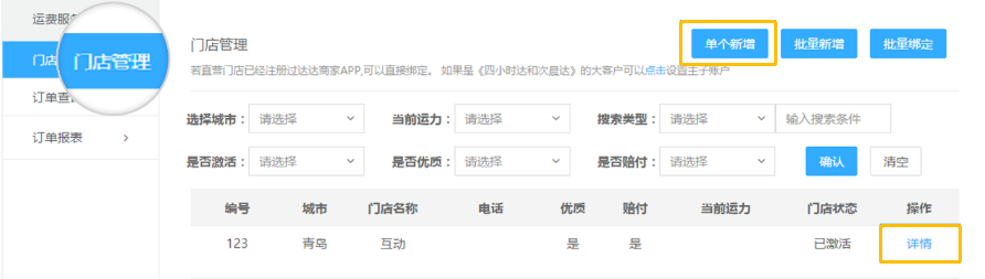 第五步:门店编号信息,也是在商户账号后台中获取,但是得需要创建门店,达达审核通过后才能获取到,点击管理中心——门店管理——单个新增