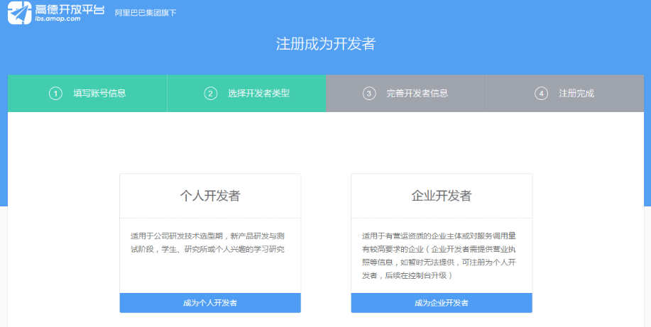 第二步:账号信息填写完毕后,直接选择开发者的类型,个人和企业两种方式,个人和企业区别就是限制的次数不同,您可以根据实际需求进行选择即可。