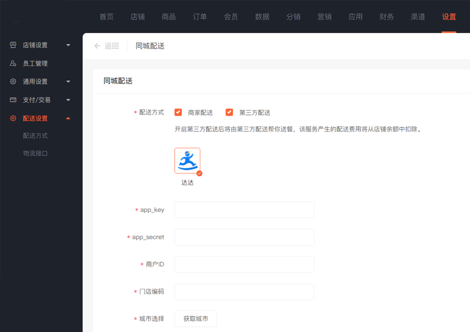第三方配送有达达配送,产生的费用将从店铺余额中扣除。使用第三方配送首先要注册达达商户平台。