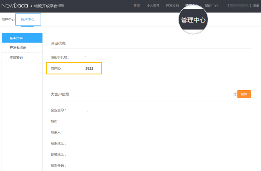 第四步:商户ID的获取,需要登录商户账号后台,点击管理中心——基本资料——商户ID