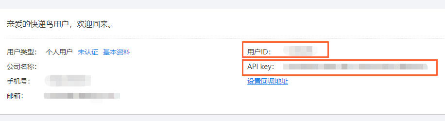 第二步:用户ID、API key参数获取位置:登录快递鸟账户——我的会员中心。复制参数到业务端后台。