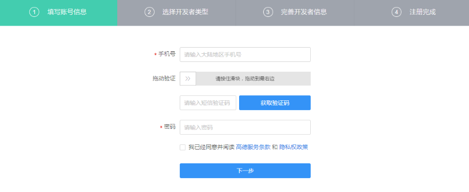 第一步:点击[高德开放平台](https://lbs.amap.com/),然后点击注册——填写注册信息。