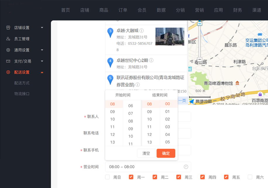 填写联系人、联系电话、联系手机以及营业时间。会员可在该营业时间段取货。
