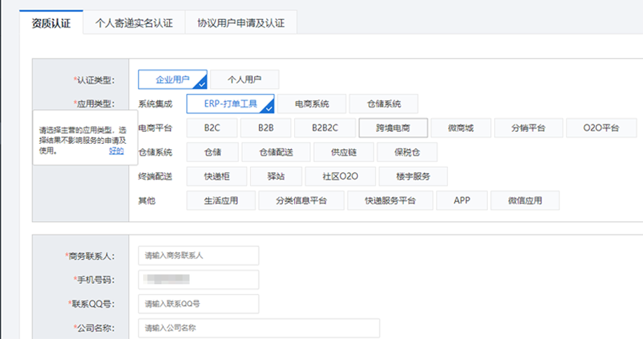 直接点击链接[https://www.kuaidi100.com/openapi/applyapi.shtml](https://www.kuaidi100.com/openapi/applyapi.shtml)直接选择申请免费版,根据提供的信息填写完毕并审核通过后(填写的资料信息如有疑问直接联系快递100客服咨询即可),会在你填写的邮箱中发送秘钥信息,直接填写到业务端。