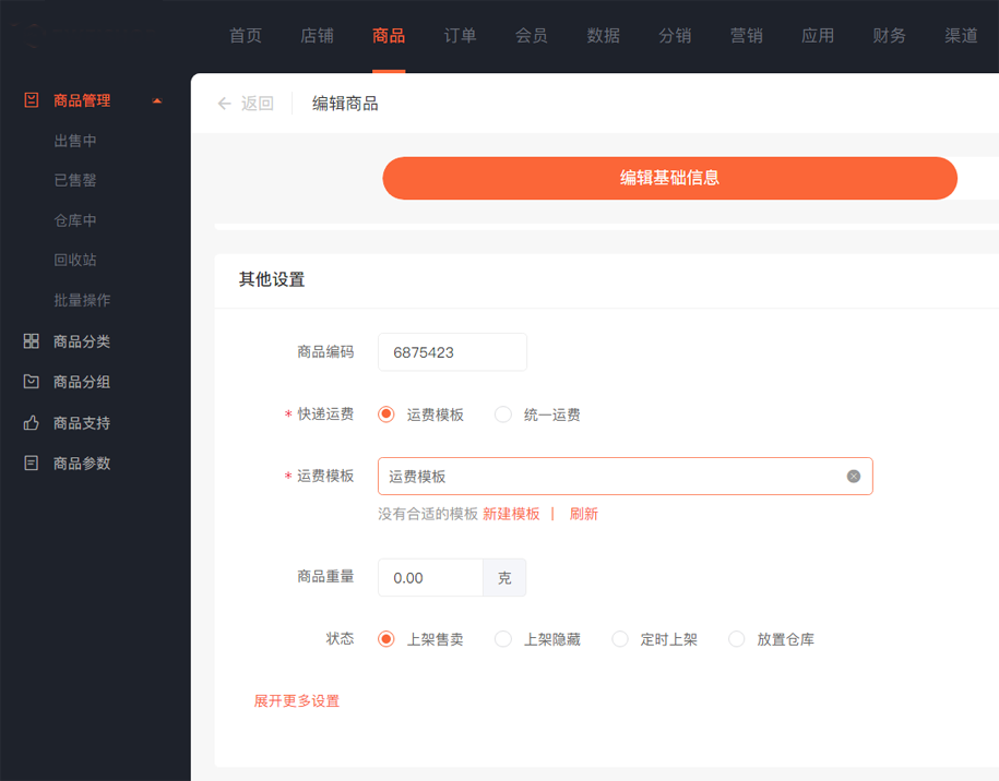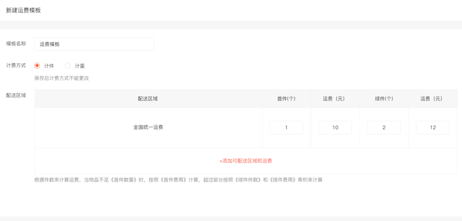 点击设置—配送设置—配送方式—快递发货—创建模版