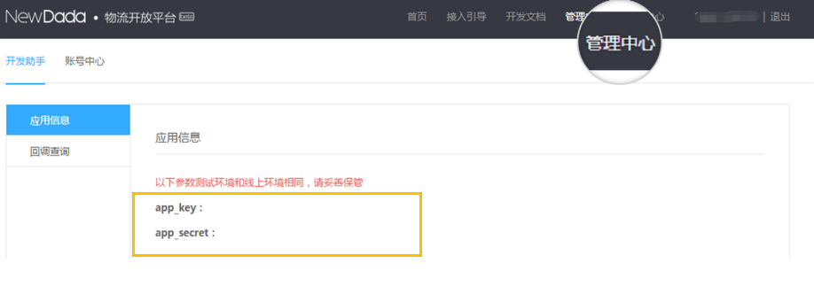 第三步:在注册的开发者账号中获取app\_key、app\_secret,点击管理中心——应用信息