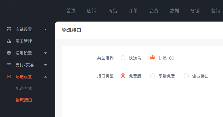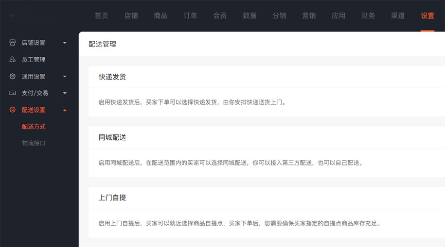 业务端商家在配送设置中管理快递发货、同城配送和上门自提,设置商家物流接口,以便商家查询物流信息。