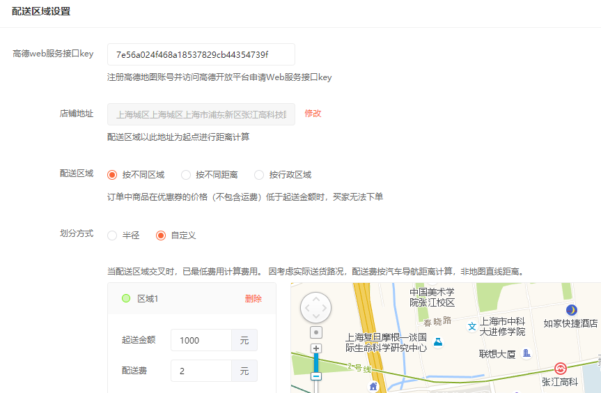 同城配送要设置区域,需要注册高德账号,进行获取key参数信息,才能正常设置同城配送信息。