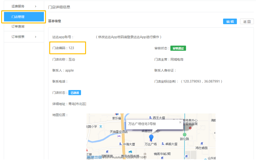 达达审核通过后,直接点击详情获取门店的编码信息,将获取的信息填写到业务端后台即可。