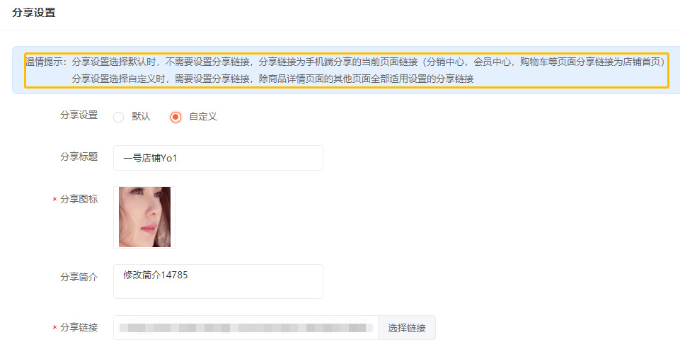 选择自定义,需要设置分享链接,除商品详情页面,其他页面全部适用设置的分享链接。