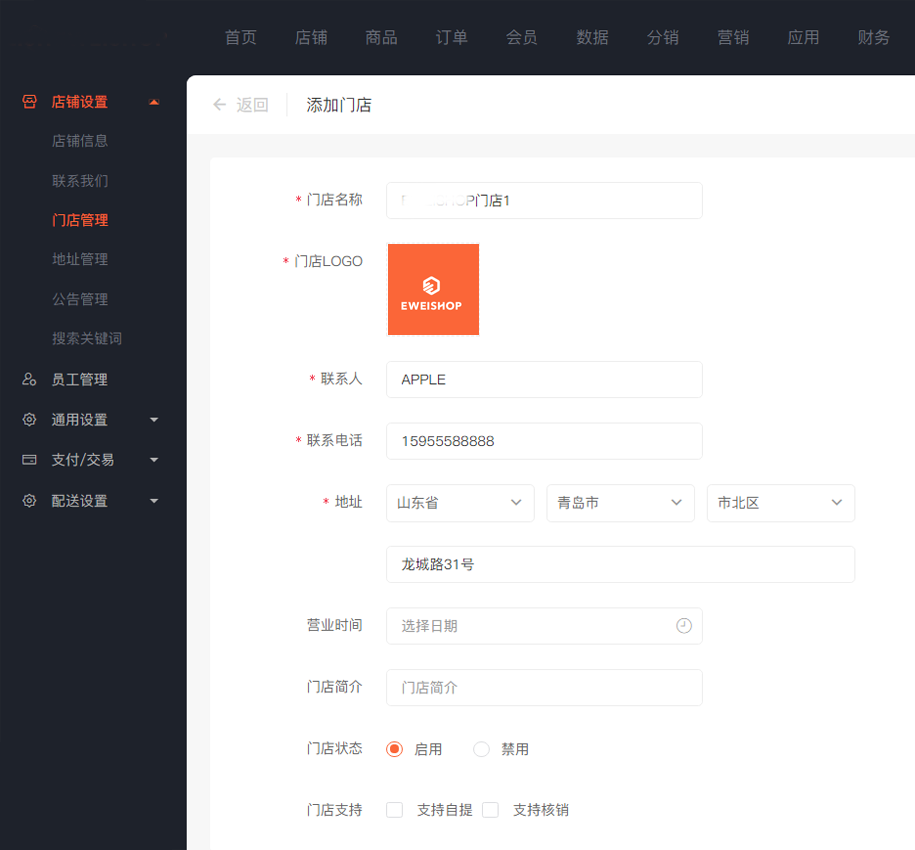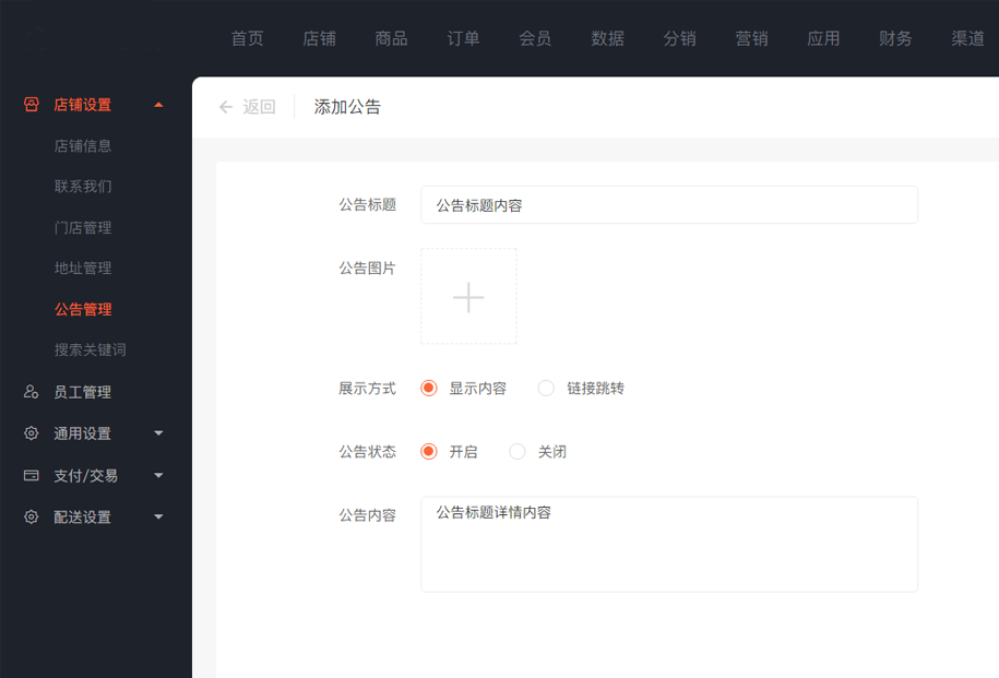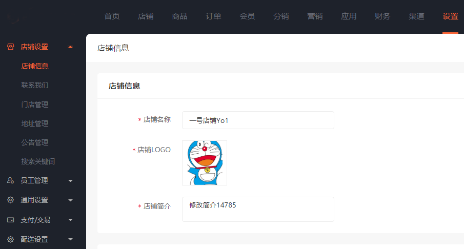 业务端的店铺设置分为店铺信息、联系我们、门店管理、地址管理、公告管理和搜索关键词,商家在此设置店铺信息、地址、门店、公告和关键词等。