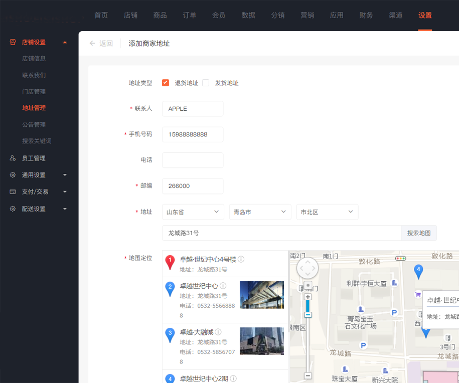 添加商家地址,选择退货地址或发货地址,填写相应信息,可设置默认的退货地址或发货地址。